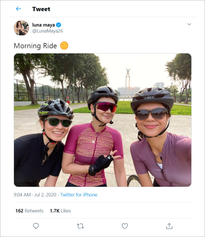 Sepeda bukan sesuatu yang asing buat gue ungkapnya dalam vlog bertajuk Luna Maya Dibully Gara-Gara Olah Raga Sepeda Nggak Pake Masker Apa Kata Pakar. Luna Maya tetap menyempatkan diri untuk olahraga. Hal tersebut disampaikan Luna Maya saat berbincang dengan Kepala Tim Kedokteran Timnas saat ASEAN Games Andi Kurniawan di kanal YouTube Luna Maya.
